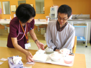 食事メニューの理解から、食べるためには、箸やフォークの使い方、茶碗の持ち方まで自分で行うリハビリにもなり、また成果を実感する場所でもあります。![]() |
